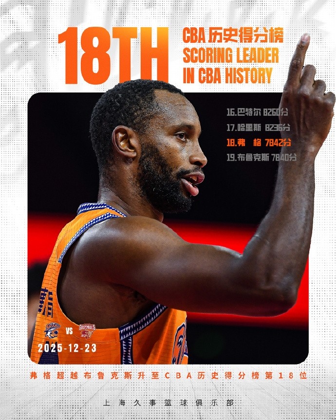 上海男篮官方晒出数据:随着弗格在第三节命中一记三分,他的CBA生涯总得分来到7842分,超越马尚·布鲁克斯升至CBA历史得分榜第18位!
