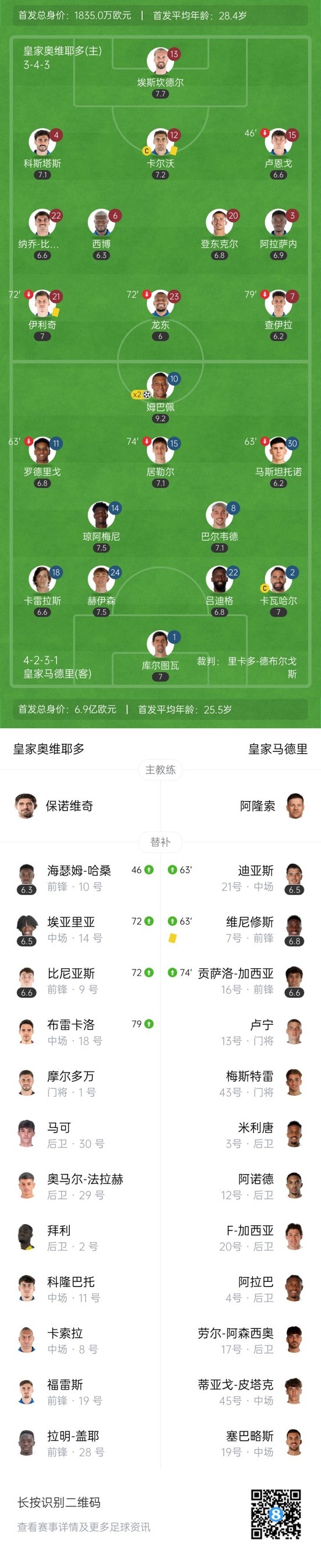下半场补时3分钟,皇家奥维耶多0-3皇马。