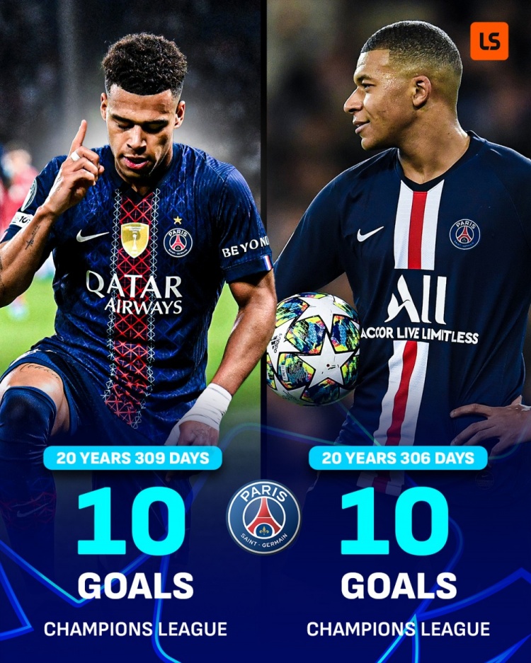 姆巴佩是在 20岁 306天时为巴黎在欧冠打进 10球,杜埃则是 20岁 309天。